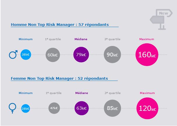Chez les « top risk managers », cet écart se maintient à 16 000 euros (89 000 euros pour les femmes et 105 000 euros chez les hommes). En revanche, les écarts se creusent, aussi bien chez les « tops » que les « non tops », à mesure que les salaires augmentent. Cet écart est ainsi de 29 000 euros entre hommes et femmes « tops » dans le 3e quartile.