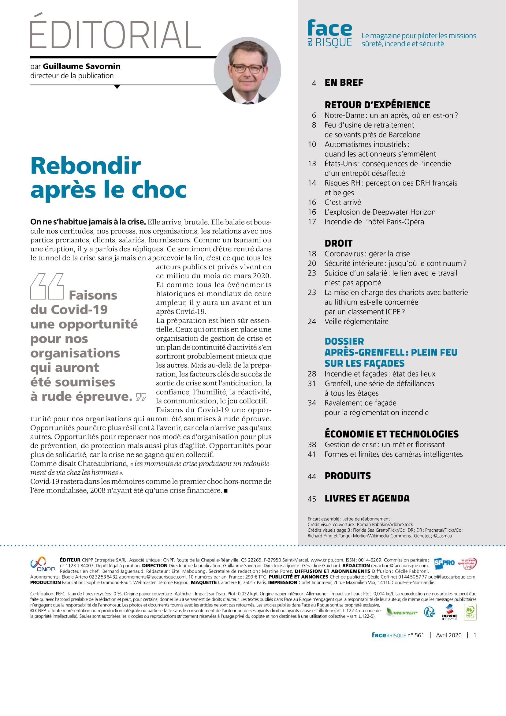 L’équipe de Face au Risque tient malgré tout à se montrer solidaire envers ses lecteurs en cette période de confinement. Dans l’attente d’un retour à la normale, la version numérique de ce numéro 561 est mise à votre disposition en accès gratuit depuis le mercredi 1er avril.
