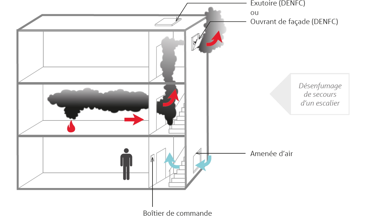 Les moyens de protection contre l’incendie dans un bâtiment passent par différentes techniques et technologies de sécurité. L’objectif du désenfumage est d’extraire des locaux une partie des fumées et des gaz de combustion. On sait en effet que lors d’un incendie la première cause de décès est la présence de fumées et de gaz. Le désenfumage participe donc à la protection de la santé et de la vie des occupants en favorisant leur évacuation, en facilitant l’intervention des secours et en limitant la propagation du feu au reste des locaux.