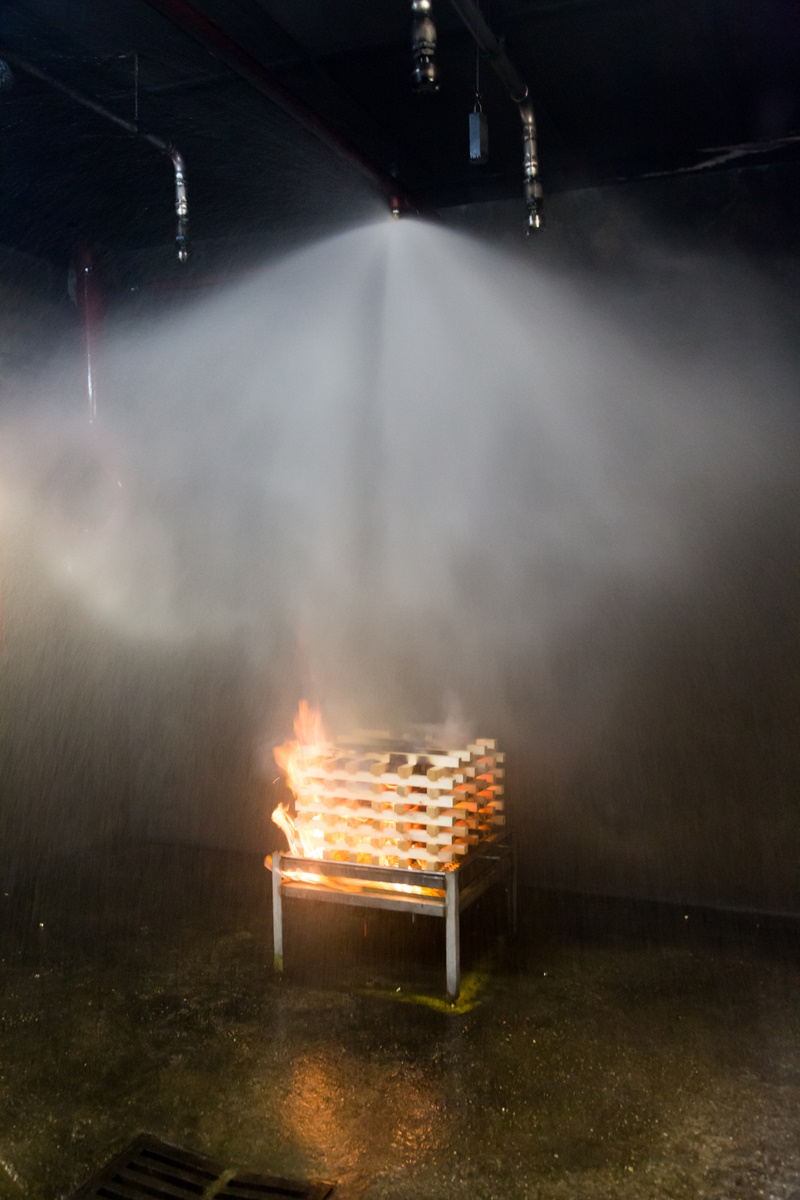 Démonstration d’un système d’extinction automatique à eau de type sprinkleur – Crédit : CNPP