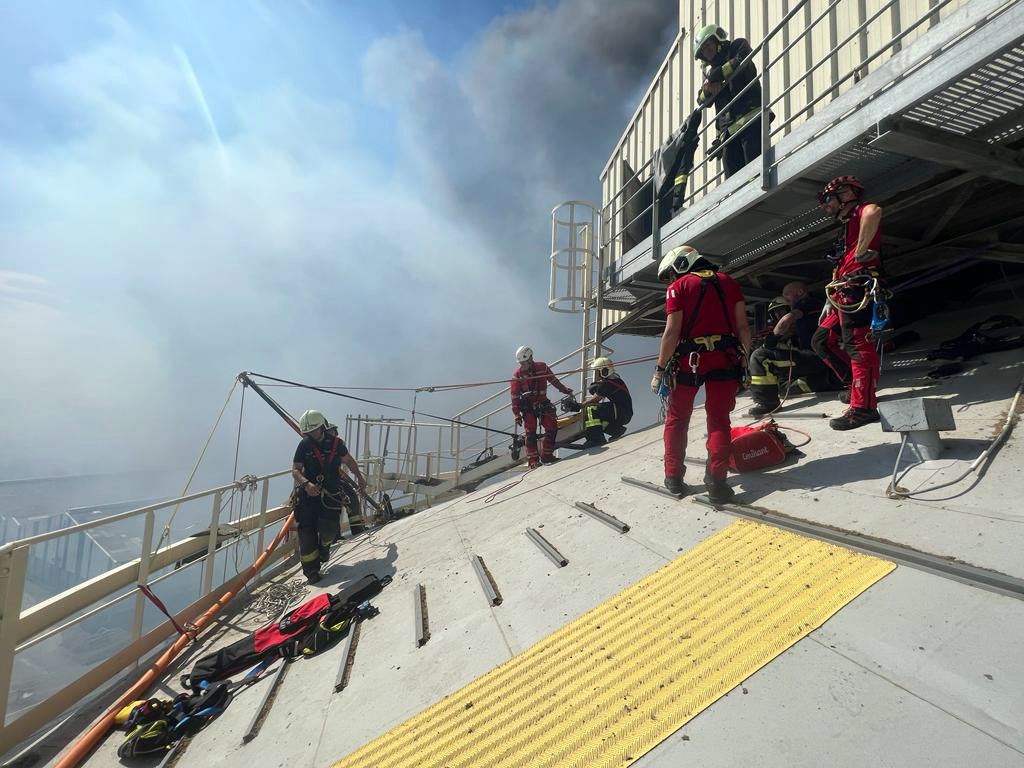 Un important panache de fumée balaye déjà le sommet de l’édifice lorsque les premiers secours se présentent à 8 h 18. Le site a été évacué à l’exception de six collaborateurs restés au bâtiment administratif, hors du périmètre de sécurité de 100 m immédiatement établi. Le plan d’opération interne (POI) est déclenché ainsi que le centre opérationnel départemental (COD).