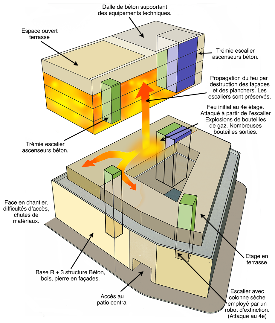 Ici, les pompiers ont tenté une attaque ciblée au 4e étage, à partir de la trémie de béton regroupant les gaines d’ascenseur et l’escalier, sur un feu paraissant contrôlable. C’est dans ce type de construction la partie assurant la meilleure stabilité, et pouvant servir de tour d’incendie, dès lors que l’on est en phase d’exploitation et que les portes coupe-feu sont présentes. En phase chantier le compartimentage est amoindri, voire inexistant.